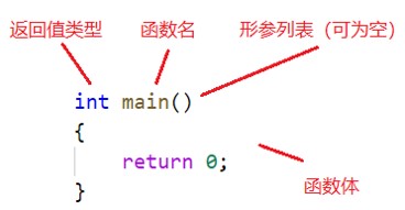 C++程序包含一个或多个函数,其中必须包括一个主函数,主函数是程序运行的入口。对于主函数,结构如下: